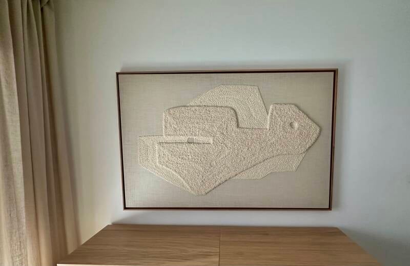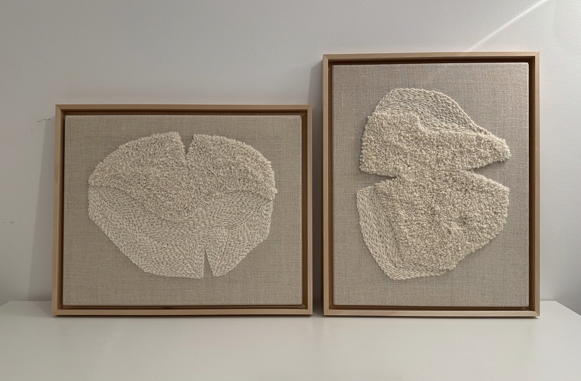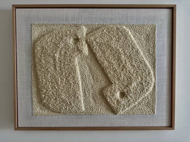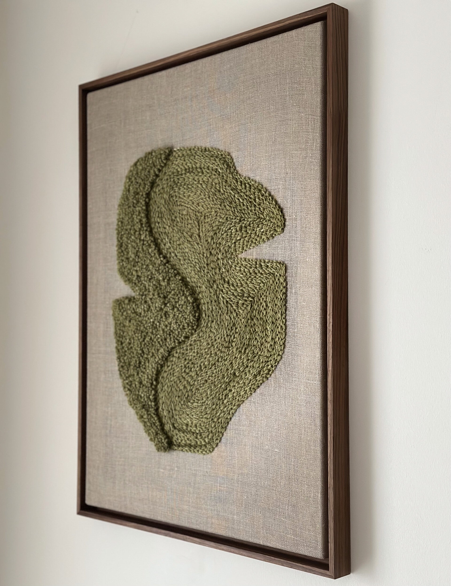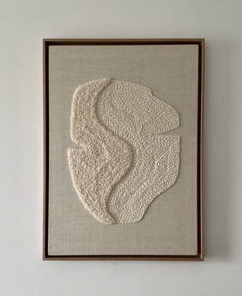 Haft naturalną wełną owczą na naturalnym lnianym podłoż, oprawiony w drewnianą ramę