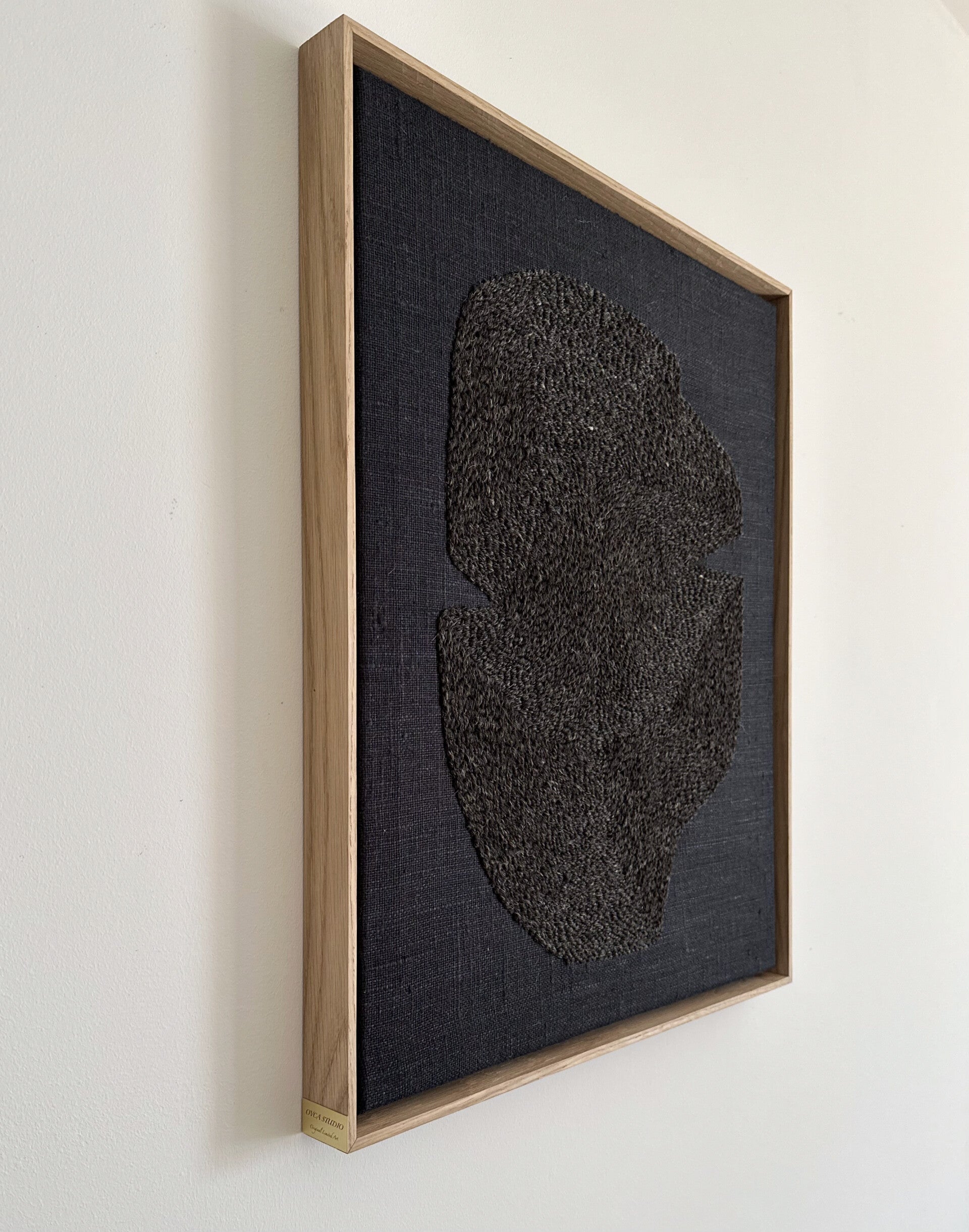 Haft naturalną wełną owczą na lnianym podłożu, oprawione w naturalną ,drewnianą , dębową ramę