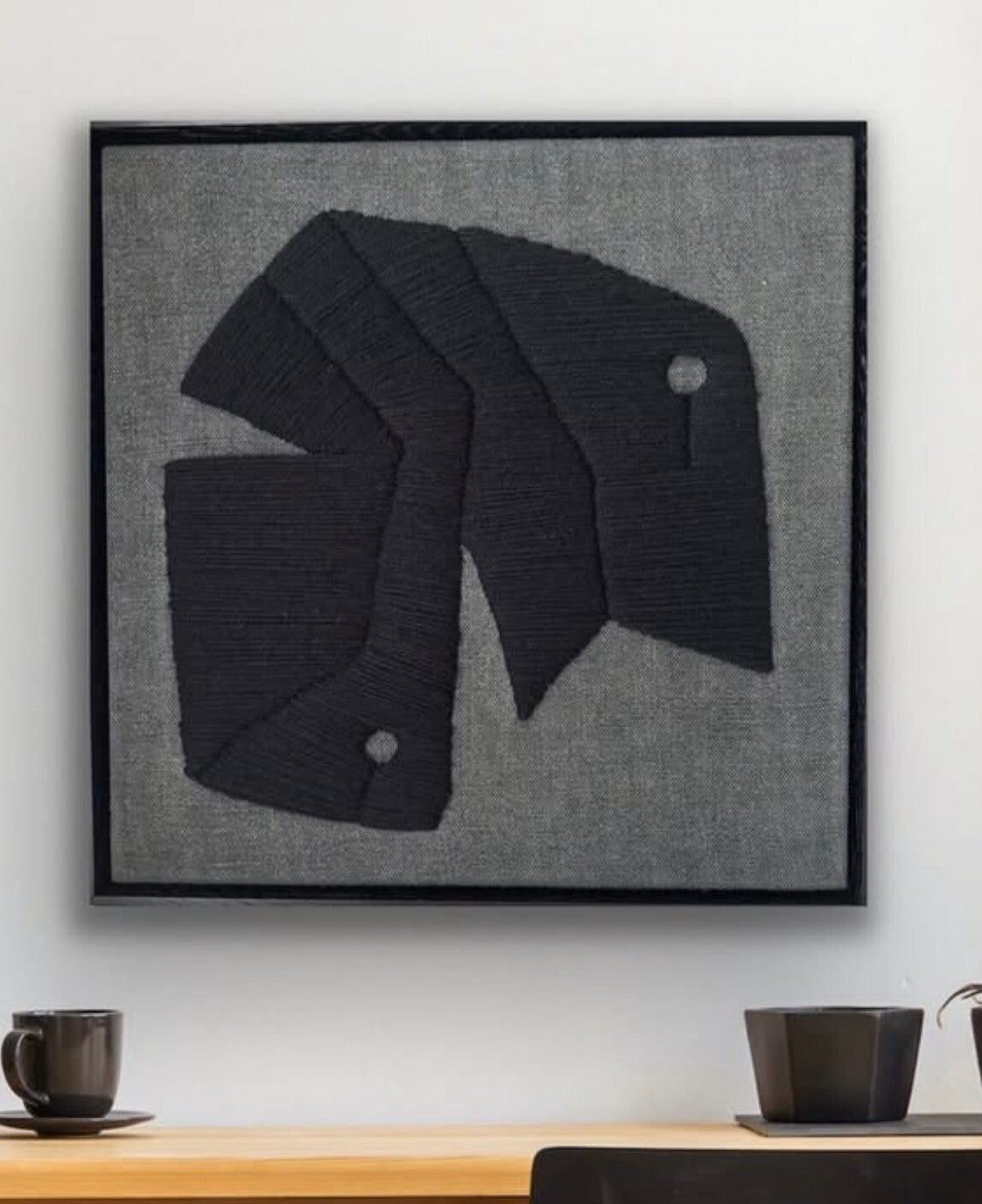 Haft sznurkiem jutowym na lnianym podłożu, oprawiony w głęboką, drewnianą, czarną ramę.